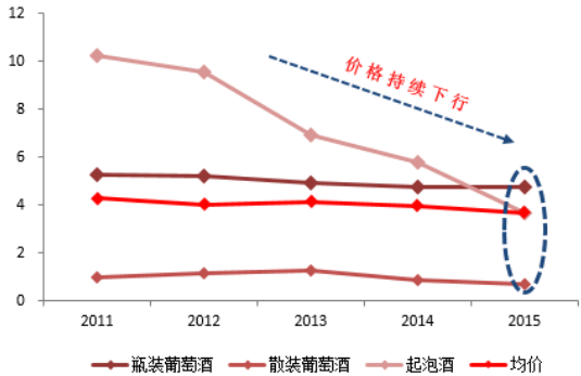 2015年進口葡萄酒均價持續下行(單位:元 / 升)
