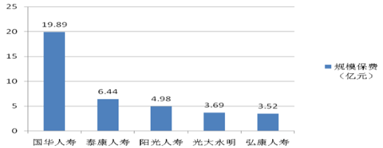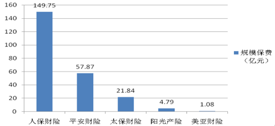 2013 年,在 60 家公司中,互聯網規模保費排名前 5 的公司分別是人保財險、平安財險、太保財險、國華人壽、泰康人壽,具體規模和排名見下圖,可見保費規模加速遞減: