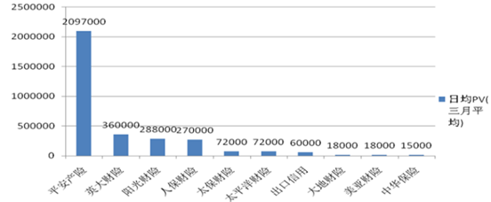 根據 Alexa 數據統計出相關互聯網保險公司日均 PV(三月平均)。根據統計數據可以看出,在人身險公司中,日均 PV(三月平均)排名前 3的公司分別為:泰康人壽,平安人險,陽光人壽,在前 10名公司日均 PV出現巨大分化: