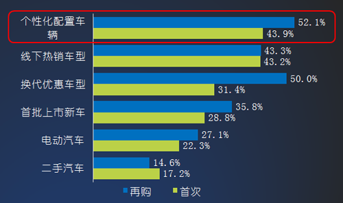 而在消費習慣方面,我們可以看到,二次購車的消費者,會更注重車輛的配置,車輛的優惠及電動車的選擇,相反,十分有趣的現象是,在中國,二手車更受首次購車的消費者青睞,二次購車的消費者對于二手車的青睞程度明顯有所降低。