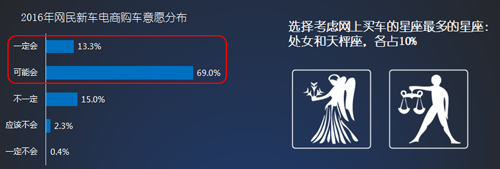 與此同時,人們在對于汽車消費理念的變更,也使得汽車電商的推廣得到了可能。根據數據顯示,已經有13.3%的用戶可以接受互聯網購車,而有69%的用戶表示可能會考慮這種新穎的購車模式。在這個數據中,射手座和天秤座占比最高。