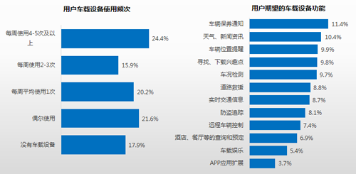 今天的最后一個干貨數據,與如今車聯網有關,根據調查24.4%的用戶每周使用汽車車載設備的次數在4-5次,應該說,汽車的互聯系統被消費者的接受率還是十分高的。而在問及消費者所期待的車載功能時,保養服務通知被排第一位,占據了11.4%,其次是天氣、新聞;不過,讓小編有點震驚的是,車輛位置提醒被排在了第三位……具體,大家自己看圖表吧~