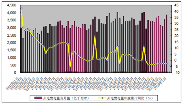 2010-2016年火電當月發電量及累計同比