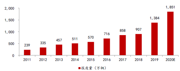 我國汽車的使用年限一般為8-10 年,參考行駛里程為50-60 萬公里。隨著汽車保有量的持續增長,廢舊汽車報廢量也將相應大幅增加。根據既有汽車產銷量和保有量的數據,我們預計中國汽車報廢高峰已臨近,今年廢舊汽車理論報廢量將突破700 萬輛,2019 年左右將超過1300 萬輛,并保持高速增長。2011-2022年中國廢舊汽車理論報廢量(萬輛)