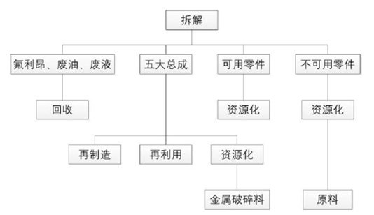 二、中國汽車拆解行業政策利好影響汽車拆解行業發展的另一個因素在于牌照管理和零部件再制造的禁止。牌照問題:目前,汽車拆解牌照仍在各地級市,報廢汽車異地報廢較為困難,這導致汽車拆解難以形成規模效應。不過隨著產業的發展,我們認為該問題有望被解決,格林美在湖北、江西已經取得了一些突破。零部件再制造:在拆解過程中獲得零部件通常含有磨損、裂縫、破碎等缺陷,上述缺陷影響零部件再利用的主要障礙。通過一定的工藝,對廢舊零部件所含有的缺陷進行處理,消除缺陷,能夠使零部件性能達到重新利用的水平,被稱為再制造工藝。再制造的工藝可以分為兩大類:第一類:進行機械加工,使零部件恢復正常的尺寸和機械配合特性;第二類:利用堆焊、化學鍍和噴涂電鍍等方法對缺陷部位進行增補修復,或對脹大、縮小燈壓力加工方法是零部件恢復其應有的幾何尺寸和表面狀態。由于報廢零部件尺寸有別、所含有的缺陷各異,通常很難通過大規模自動化生產線進行統一處理。所以再制造過程一般仍以人工輔助相應設備進行處理。常用的設備包括:機加工設備、焊機、電鍍設備等等。汽車拆解中可用零部件再制造后出售,回收利潤將大幅提高。隨著產業規模的壯大,我們預計1-2內有相關政策出臺也會是大概率事件,放開汽車零部件再制造,指定示范企業試點。同時也會加強監管,完善行業標準、信息管理體系、生命周期測算和保險等配套政策。通過零部件再制造,汽車拆解后銷售收入可在現有基礎上再提高3000 元以上,帶來行業300 億元產值的提升空間。三、中國汽車拆解行業市場空間預測汽車報廢量的激增,給汽車拆解行業帶來了巨大的市場空間,利好具有汽車拆解資質的企業。目前廢舊汽車拆解行業發展不成熟,拆解過程機械化程度低,大致拆解流程分為廢油廢液前處理、五大總成拆卸、零部件拆卸、破碎分選等部分(破碎分選部分一般企業仍未做),利潤率較低。廢舊汽車拆解流程