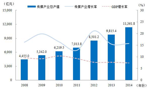 勢上看,傳媒業(yè)近年來基本保持高于GDP增速的增長趨勢。2014年中國傳媒業(yè)的總產(chǎn)值為11,361.8億元,同比上年增長15.8%。