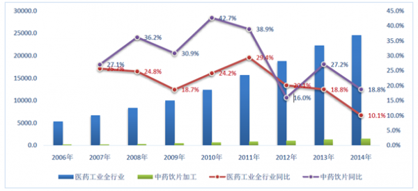 2006-2014年中國醫(yī)藥工業(yè)、中藥飲片子行業(yè)年銷售收入及增速