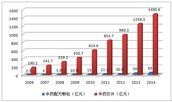 我國中藥配方顆粒近年來銷售收入增長迅速,據(jù)前瞻網(wǎng)數(shù)據(jù),銷售收入從2006年的2.3億元增長到2013年的50.0億元左右,2014年約65.0億左右,年復合增長率達52%,中藥配方顆粒在中藥飲片中的比重也從1.2%提升到4.3%左右,預計未來幾年仍能保持30%以上速度增長,2016年將突破百億規(guī)模。