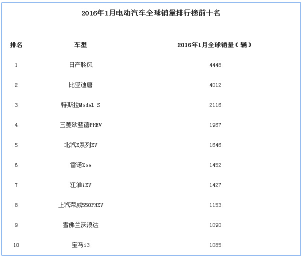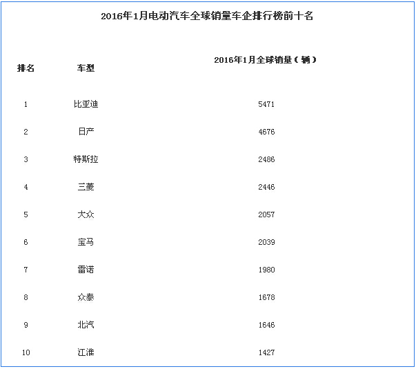 2016年1月全球電動汽車企業銷量排名:比亞迪第一