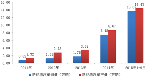 2011 年~2015 年前三季度國內新能源汽車產銷量情況