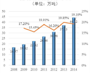 根據中元智盛對水刺非織布行業的調查分析,近幾年水刺非織造布產量高速增 長,至 2014 年產量達 44.22 萬噸,同比增長 19.10%。根據中國產業用紡織品行業協會數據,2014 年水刺非織造布產量占非織造布產量的 10%。水刺工藝是所 有生產非織造布工藝中增長快的工藝。