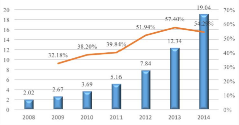 受益于水刺非織造布行業的快速發展,行業利潤也呈高速發展趨勢。根據中 元智盛數據,2014 年水刺非織造布行業凈利潤達 19.04 億元,同比增長 54.29%。