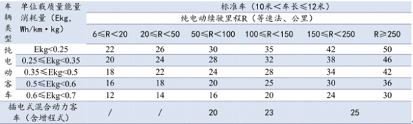 對于新能源客車,補助標準以10-12米客車為標準車給予補助,其他長度純電動客車補助標準按照上表單位載質量能量消耗量和純電動續駛里程劃分,插電式混合動力客車(含增程式)補助標準按照上表純電動續駛里程劃分。其中6米及以下客車按照標準車0.2倍給予補助;6米<車長≤8米客車按照標準車0.5倍給予補助;8米<車長≤10米客車按照標準車0.8倍給予補助;12米以上、雙層客車按照標準車1.2倍給予補助。