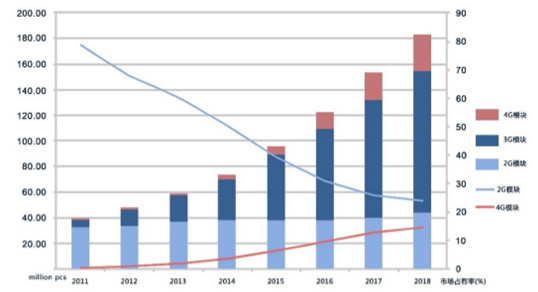 2012 年 3G 通信網絡逐步成熟,中國三大運營商新增用戶突破 3 億,通信模塊領域仍以 2G 制式為主導。但進入 2015 年后,4G 網絡增長迅猛,澳洲電信宣布