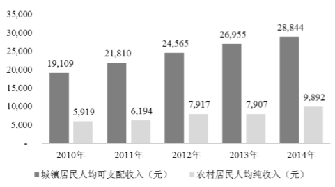 根據國家統計局統計,2005 年至 2014 年,隨著我國經濟高速發展,我國城鎮居民可支配收入和城鎮居民家庭人均消費支出持續增加,從實際購買力角度 看,居民支付能力具備消費升級的基礎和支撐。