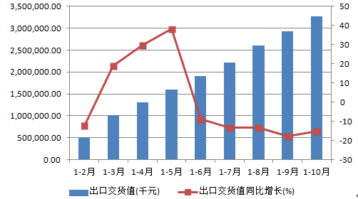 2015年10月中國白酒制造出口交貨值333,633.00千元,同比增長16.71%;2015年1-10月中國白酒制造出口交貨值3,264,302.00千元,同比下降15.09%。