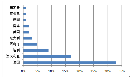 中國海關2016 年1 月26 日發布的數據,歐盟為主要進口來源地,自智利和澳大利亞進口快速增加。2015 年,我國自歐盟進口葡萄酒3.2 億升,增加33%,占比由2014 年的59%下降至55.1%。其中自法國進口2 億升,增加29.1%;自西班牙進口7783 萬升,增加56.6%。同期,自智利進口1.5 億升,增加69.3%,占比由2014 年的22.2%上升至26.4%;自澳大利亞進口6863 萬升,增加67.6%,占比由2014 年的10%上升至11.8%。從進口來源地市場分布來看看,2014、 2015 年,十大進口葡萄酒來源國座次基本穩定。法國占據進口來源地首位,澳大利亞份額增長比較明顯,從11%增長到17%的份額,從數據上來解讀是2015年的贏家。
