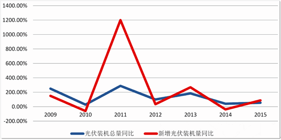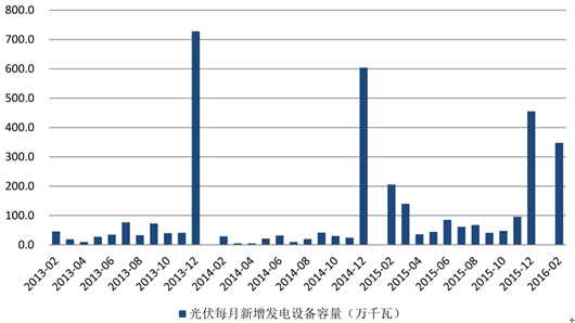 從同比增速來看, 近年來我國光伏累計裝機量總體來說維持了較為高速的增長, 但增速呈現階梯狀回落的格局,累計同比從 2011 年的 288%逐漸回落至 2015 年的 54.21%。從新增裝機量來看,呈現出較大的起伏,2014 年的新增裝機同比更是回落至-37.21%。自 2015 年下半年以來, 我國光伏行業在國家光伏電價補貼將于 2016 年 6 月開始下調的影響, 在搶裝效應下市場景氣度出現了超預期回升。 從我國每月新增光伏發電設備容量統計數據來看,光伏裝機的年底搶裝效應十分顯著,但自 2015 年 4 月份以來光伏新增裝機量持續高于同期,整體光伏電站的搶裝潮對整個光伏產業鏈都帶來了直接的拉動效應。