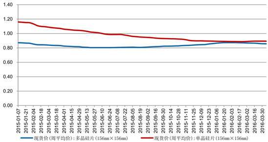 2015 年上半年在具體補貼政策尚未明朗的情況下,光伏裝機推進緩慢、需求疲軟,硅片價格一路下滑。156mm 多晶硅片單價從 1 月初的 0.87 美元/片緩慢下滑至六月底的0.80 元美元/片,跌幅為 8%;隨后光伏市場逐漸回暖,硅片價格一路溫和回漲至 12 月底的 0.86 美元/片。