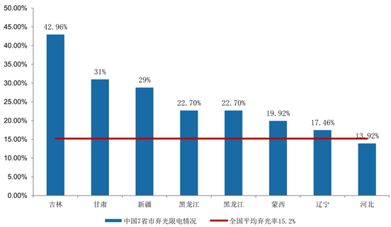 2015 年全國累計光伏發電達 400 億千瓦時,棄光電量約為 40 億千瓦時,棄光率達 10%左右。 其中,以吉林、甘肅和新疆地區棄光最為嚴重,甘肅地區棄光電量 17.6億千瓦時,棄光率高達 28%;新疆地區棄光電量 10.4 億千瓦時,棄光率 20%;吉林地區的棄光率更是高達 43%。分析各地區的光伏裝機容量以及棄光情況發現,并非光伏裝機容量高的地區棄光率也高。目前我國光伏裝機容量最大的地區分別是甘肅、 青海、 內蒙古、新疆、寧夏、江蘇六個省份,但僅甘肅和新疆兩地的棄光電量就占據全國光伏棄光電量的絕大多數。