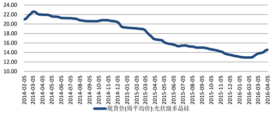 價格方面, 受制于國外進口的量價雙重壓力, 國內多晶硅企業為了降低成本不得不滿產甚至擴產,導致 2015 年多晶硅價格全年一路下跌。從供需角度看,2015 年中國多晶硅產量為 16.9 萬噸,進口量 11.6 萬噸,總供應量為 28.5 萬噸;而消費量為 26 萬噸(包括0.7 萬噸出口),再加之 2014 年國內多晶硅生產企業的庫存 0.6 萬噸以及下游中間環節庫存 0.9 萬噸(半個月的正常流轉庫存),因此 2015 年全年多晶硅供應過剩 1 萬噸。因此國內多晶硅供應量一直維持相對充足的狀態,預計 2016 年受企業生產成本逐漸下降以及供應持續充足的影響,多晶硅價格仍然以下行為主。