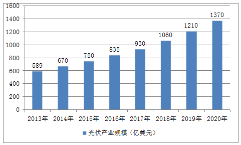光伏產業的蓬勃發展受到溫室氣體減排、能源自給及能源安全的驅動。業內預計全球光伏產業規模將從2013年的598.4億美元增長至2020年的1370.2億美元。