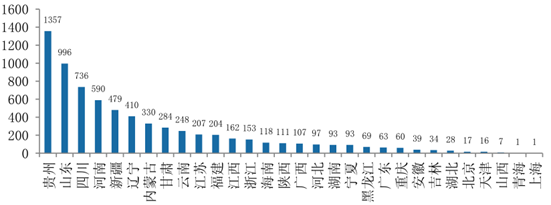 PPP 項(xiàng)目的地區(qū)分布差異較大,數(shù)量最多的 5 個(gè)地區(qū)是貴州、山東、四川、河南和新疆,共占項(xiàng)目總數(shù)的 58.5%;數(shù)量最少的 5 個(gè)地區(qū)是上海、青海、山西、天津和北京,只占項(xiàng)目總數(shù)的 0.59%。