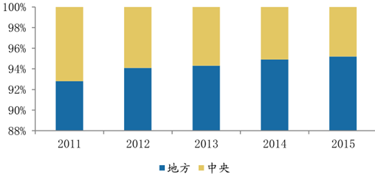 固定資產(chǎn)投資分為中央投資和地方投資兩大部分,中央投資的部分呈現(xiàn)出逐年下降的趨勢(shì), 我國(guó)全社會(huì)固定資產(chǎn)投資依舊依賴于地方政府投資,且地方政府投資占比逐年上升。2015 年地方全社會(huì)固定資產(chǎn)投資占比達(dá)到 95.2%。因此,我們可以通過(guò)預(yù)測(cè)各個(gè)省市固定資產(chǎn)投資增速大致來(lái)預(yù)測(cè)全國(guó)固定資產(chǎn)投資增速。