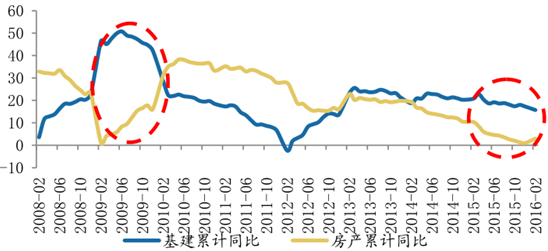 基建投資方面,近幾年基建投資對(duì)房地產(chǎn)投資起著對(duì)沖器的作用。2015年房地產(chǎn)投資在固定資產(chǎn)投資中占比較2014年下降9.5個(gè)百分點(diǎn),降幅劇烈;而基建投資占比較2014年下降三個(gè)百分點(diǎn)。當(dāng)房地產(chǎn)投資增速持續(xù)走低,政策通常會(huì)加大基礎(chǔ)設(shè)施投資力度,利用基礎(chǔ)設(shè)施投資對(duì)沖房地產(chǎn)投資增速放緩,預(yù)計(jì)2016年這種對(duì)沖器的效應(yīng)仍然會(huì)起作用。
