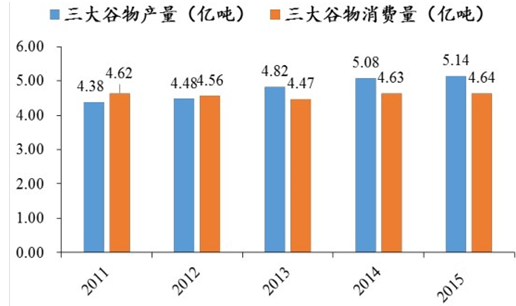 2011-2015年中國(guó)三大谷物產(chǎn)量與消費(fèi)量對(duì)比