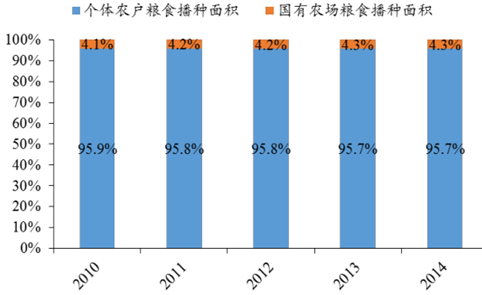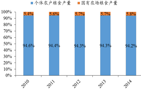 我國(guó)現(xiàn)階段糧食種植主要有兩種模式,一是國(guó)有農(nóng)場(chǎng),二是建立在家庭承包責(zé)任制基礎(chǔ)上的以農(nóng)戶(hù)為單位的種植。目前階段,建立在家庭承包責(zé)任制基礎(chǔ)上的以農(nóng)戶(hù)為單位的種植,是我國(guó)糧食生產(chǎn)的主要模式。2014 年,農(nóng)戶(hù)種植糧食總產(chǎn)量占全國(guó)糧食產(chǎn)量比重高達(dá) 94.2%,糧食播種面積占比 95.7%;但由于單個(gè)農(nóng)戶(hù)生產(chǎn)規(guī)模小,資金能力有限,很難實(shí)現(xiàn)規(guī)模化和機(jī)械化,仍然處于粗放式的生產(chǎn)階段。國(guó)有農(nóng)場(chǎng)因其單個(gè)農(nóng)場(chǎng)種植面積較大,故能夠較好實(shí)現(xiàn)機(jī)械化和規(guī)模化作業(yè),但受限于其在糧食總產(chǎn)量中的比重小,并非我國(guó)主要種植模式。
