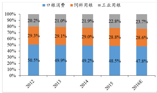 2012-2016糧食用途消費(fèi)結(jié)構(gòu)占比