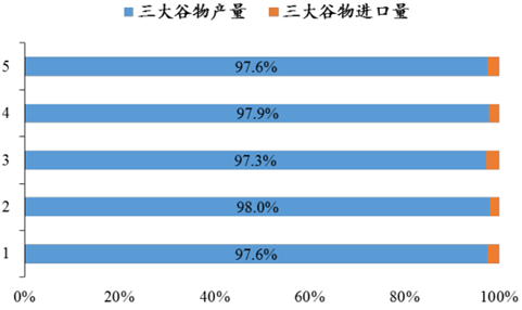 2011-2015年中國(guó)三大谷物產(chǎn)量與進(jìn)口占比