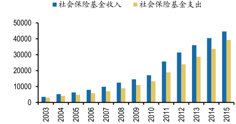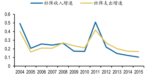 60%的中央彩票公益金被用來補(bǔ)充社會保障基金,其目的是為了填充未來由于人口老齡化可能會出現(xiàn)的社會保險基金收支缺口。 未來社會保險基金賬戶出現(xiàn)收不抵支時,社會保障基金金額越充沛,差額部分越容易被對沖掉。對比我國社會保險基金收支情況,截止到 2013 年,我國社保基金尚且存在盈余,但這種盈余狀態(tài)是否存在可持續(xù)性尚不得知。反觀我國社保收入與支出的增長率,1998 年之后二者趨于穩(wěn)定,且在 1998 年至 2008 年 10 年內(nèi),社保收入的增長率皆高于社保支出,不存在收不抵支的情況。 但是 2008 年之后, 社保支出的增長率開始逐漸超過收入的增長率,這將對我國未來社保基金賬戶帶來隱患,埋下了出現(xiàn)收不抵支情況的風(fēng)險。社會保險基金收入、支出