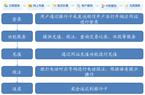 彩票產(chǎn)業(yè)在我國起步較晚,目前其銷售方式主要有實體門店銷售、電話銷售、互聯(lián)網(wǎng)銷售三種方式。電話投注以及互聯(lián)網(wǎng)投注提高了彩民購彩的便捷性,其購彩流程一般遵循“登錄/注冊——充值——投注——返獎”的順序。互聯(lián)網(wǎng)彩票規(guī)模已經(jīng)達(dá)到 850 億元左右,市場滲透率約為 22%。