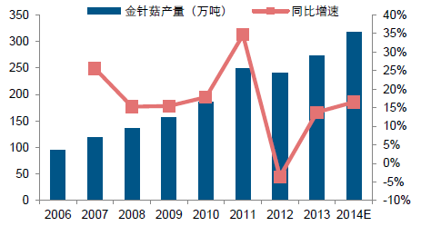 2、工廠化種植模式在中國正處在發(fā)展初期,還有很大的發(fā)展空間。2006 年以來,伴隨著中國食用菌消費(fèi)需求不斷上升,食用菌工廠化也蓬勃發(fā)展,生產(chǎn)比重不斷上升。截止到2014 年9 月,中國食用菌工廠化生產(chǎn)企業(yè)達(dá)到729 家,是2006 年47 家的16 倍。從2006 年到2014 年,中國食用菌工廠化年產(chǎn)量從8 萬噸上升至195 萬噸,年均復(fù)合增長率達(dá)49%。食用菌工廠化比例也由2006 年的0.54%逐年上升至2013 年的6.47%,預(yù)計(jì)未來10 年內(nèi)工廠化種植產(chǎn)量將占總產(chǎn)量的20%-30%。工廠化生產(chǎn)比例逐年上升是因該生產(chǎn)模式具有以下優(yōu)勢(shì):(1)極大提高食用菌生產(chǎn)效率,節(jié)約土地與勞動(dòng)力;(2)實(shí)現(xiàn)食用菌周年化生產(chǎn);(3)質(zhì)量可控,產(chǎn)品安全可靠;(4)吸收農(nóng)村富余勞動(dòng)力;(5)有利于產(chǎn)業(yè)轉(zhuǎn)型與產(chǎn)品升級(jí);(6)可復(fù)制性強(qiáng),有利于企業(yè)抓住市場(chǎng)機(jī)遇,實(shí)現(xiàn)迅速穩(wěn)定擴(kuò)張。