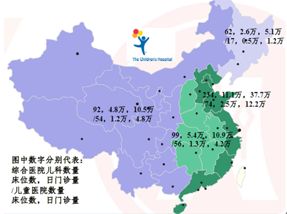 我國0-14歲人口兒童約2.3億,占全國總人口的16.6%,而兒童專科醫院占全國醫療機構的0.38%,兒科床位占全國醫院總床位數的6.4%。兒童醫院數量少。在區域分配上,兒童醫院集中分布在東南沿海經濟發展好的地區,西部地區兒科醫療服務資源嚴重緊缺,區域分布不均。