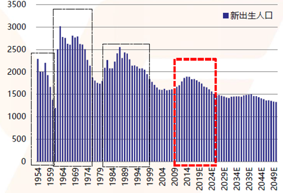 當前人口年齡主要分布以20-34歲人口為主,此人群正值婚育最佳年齡。從我國新出生人口分布看,今后9年將迎來第四次嬰兒潮,再加上二胎全面放開,每年新生兒的數量有望提升到1900萬。預計到2024年,兒童人口有望達到2.65億。