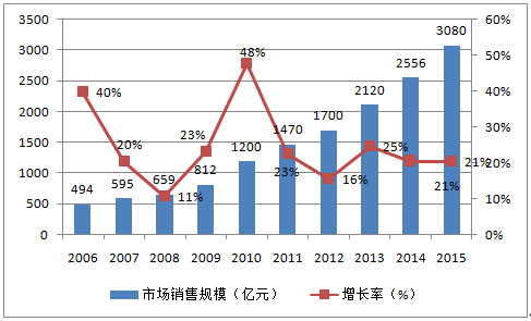2006-2015 年中國(guó)醫(yī)療器械市場(chǎng)銷(xiāo)售規(guī)模