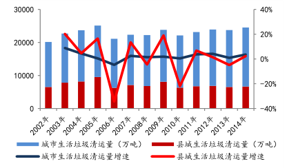 環衛服務主要收入來自于道路清掃和垃圾清運, 道路清掃比例在 70%左右。 根據 2014 年住建部統計數據,城市清掃面積為 67.6 億平方米,縣城清掃面積為 22.9 億平方米,鄉鎮達到 55 億平米。按目前的清運價格估算,城市清掃市場規模達到 540.8 億元,為最主要部分。且考慮一、二線城市目前清掃價格在 10-12 元左右,且城市平均機械化率仍僅有 50%,行業清掃平均價格有很大提升空間。同時,近 10 年來,城市環衛清掃面積年復合增速為 8.6%,縣、鎮層面增速更快,2014 年縣城清掃面積增速為 15.66%。此外,由于縣、鎮清掃機械化率僅 34.4%,所以未來清掃面積和機械化率有更大的提升空間。因此,我們預計未來 5 年,清掃產業整體仍將維持 15%以上增速繼續增長;垃圾清運層面,2014 年城市垃圾清運量為 1.79 億噸,預計總營收規模在 130 億元。