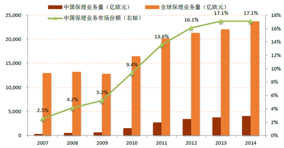 2007-2014年中國(guó)保理業(yè)務(wù)量以及占全球保理市場(chǎng)份額