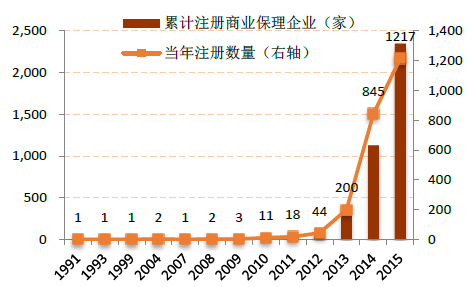 1991-2015年中國(guó)累計(jì)和新增注冊(cè)商業(yè)保理企業(yè)數(shù)量