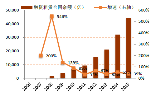 2006-2015年中國(guó)融資租賃合同余額和增速