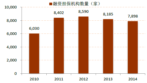 3、截至2014 年末,我國(guó)融資性擔(dān)保機(jī)構(gòu)一共7989 家,融資擔(dān)保在保余額2.34 萬(wàn)億,其中中小微企業(yè)融資性擔(dān)保占比約60%。擔(dān)保業(yè)務(wù)規(guī)模受社會(huì)融資規(guī)模影響較大,2010-2011 年融資性擔(dān)保行業(yè)在保余額經(jīng)歷快速增長(zhǎng),2012 年后隨著中國(guó)宏觀經(jīng)濟(jì)下行,擔(dān)保行業(yè)發(fā)展速度明顯放緩。受中小企業(yè)經(jīng)營(yíng)困難、信用水平下降影響,擔(dān)保行業(yè)業(yè)務(wù)風(fēng)險(xiǎn)上升,代償發(fā)生情況不斷增加,部分擔(dān)保機(jī)構(gòu)因失去代償能力而倒閉,融資擔(dān)保機(jī)構(gòu)數(shù)量連續(xù)兩年負(fù)增長(zhǎng)。