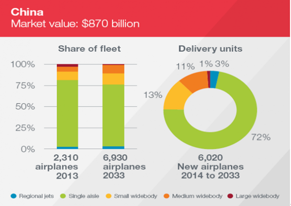 到2033年中國客機需求量將新增6020架,總價值8700億美元。中國客機保有量將從2013年2310架增長至2033年的6930架。2014-2033年中國客機需求規模達到8700億美元