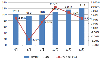 1、2015年下半年,從8月開始,中國二手車電商行業(yè)To C模式平臺月均SKU數(shù)量總體保持在95-125萬輛;12月平臺月均SKU數(shù)量最多,達(dá)到121.5萬輛。