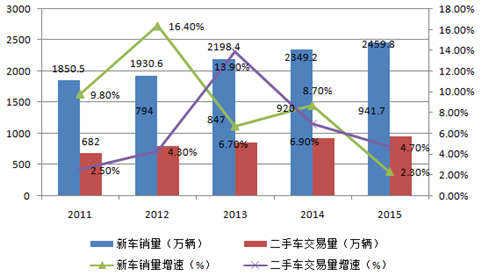 2011-2015年中國新車銷量及二手車交易量