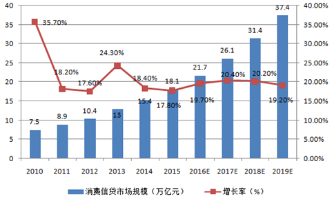 2010-2019年中國消費(fèi)信貸余額規(guī)模及增長率