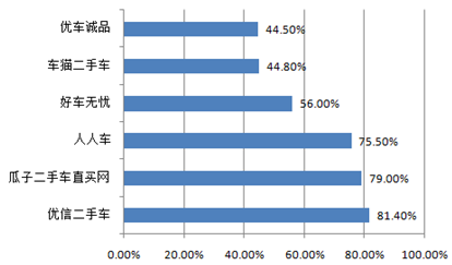 5、2015年下半年,強(qiáng)大的廣告效應(yīng)使部分二手車電商的知名度迅速提升,C端用戶對優(yōu)信二手車、瓜子二手車等企業(yè)的認(rèn)知度有明顯提升,在二手車用戶市場有超過80%的用戶知道優(yōu)信二手車,平臺認(rèn)知度最高;另外,瓜子二手車、人人車在二手車用戶中認(rèn)知度超過70%,車貓二手車在廣告力度相對較小狀態(tài)下,平臺認(rèn)知度也將近45%。