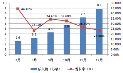 2015年下半年,To C模式交易平臺成交量呈逐月遞增趨勢,平均增長率保持在25%以上,12月份交易量達(dá)到8.9萬輛。